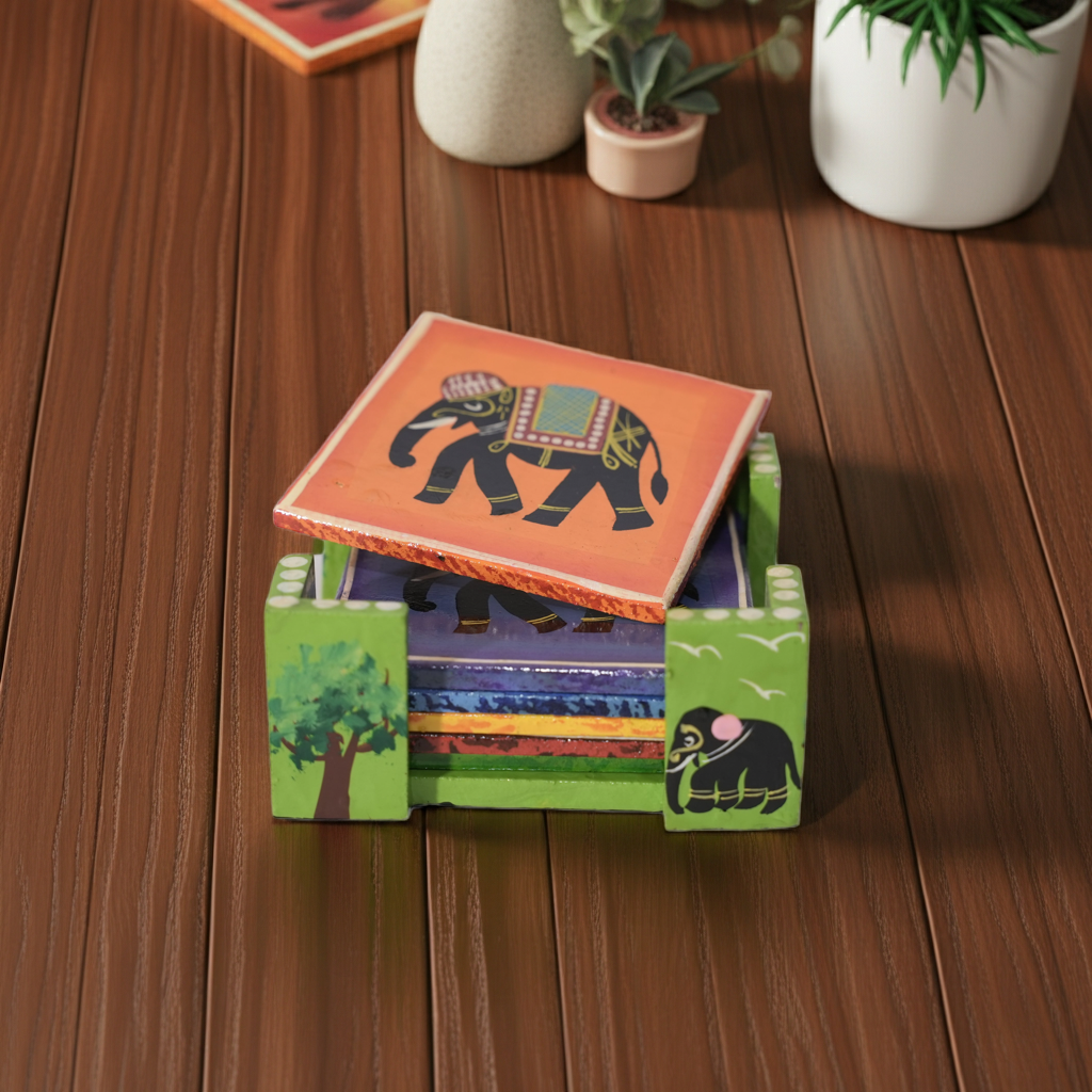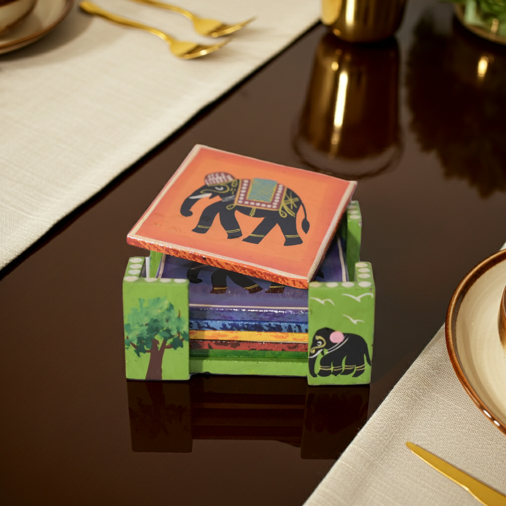 - 6 लकड़ी के कोस्टर का सेट + 1 हाथी के आकार का होल्डर।