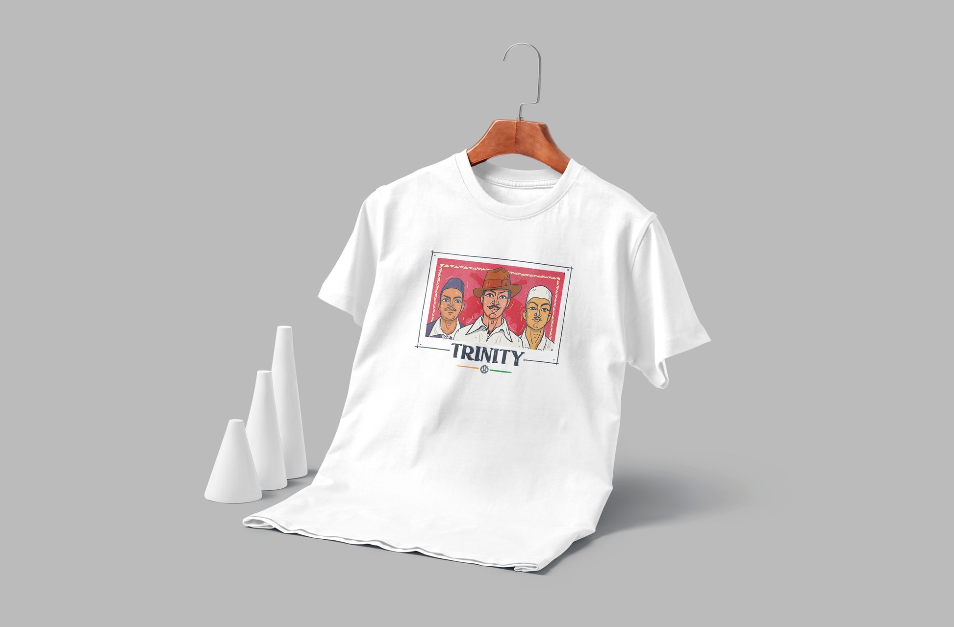 Honor the legendary heroes of India’s freedom struggle with the Trinity T-shirt. Featuring an artistic illustration of Bhagat Singh, Rajguru, and Sukhdev, this design captures their fearless spirit and enduring legacy. The bold artwork is framed with a retro-style border, while the word TRINITY is printed below, subtly accented with the tricolor. Crafted for comfort and pride, this T-shirt is perfect for those who carry the essence of patriotism in their heart.