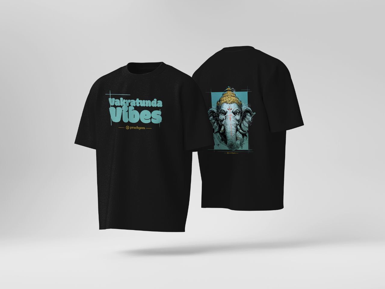 Celebrate divine energy with style. This premium black T-shirt features the bold text “Vakratunda Vibes” on the front, inspired by the powerful mantra Vakratunda Mahakaya. On the back, it showcases an intricately designed artistic illustration of Lord Ganesha, symbolizing wisdom, success, and positivity.